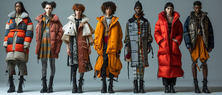 Four fashionable individuals, each wearing unique streetwear outfits, exude confidence and modern style against a textured backdrop. The vibrant colors and bold designs reflect the essence of urban fashion, appealing to trendsetters and style enthusiasts alike.