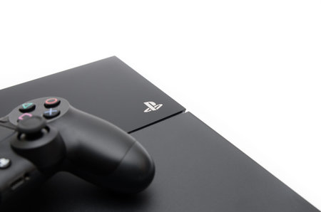 CLUJ-NAPOCA, ROMANIA - 24 FEBRUARY: Playstation 4 with the PS logo in focus and part of a dualshock 4 controller out of focus un a white isolated background suggesting modern game console branding