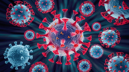 close-up coronavirus type covid-19, h1n1, bird flu or swine flu background. 3d rendering of representation of virus as microbiological microscopic background. Blue red gradient colors