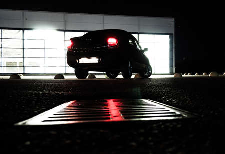 Car at night, bottom view from behind the road surface. The background is a bright showcase of an abandoned store.