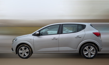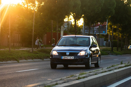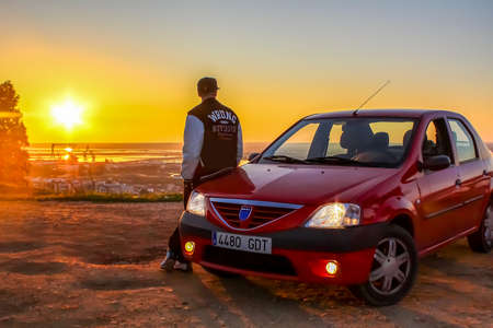Huelva, Spain - July 23, 2020: View of a red Dacia Logan at sunset