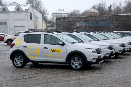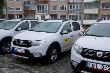 Lithuanian post cars lined up in the city hall. Kedainiai