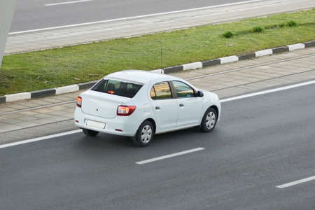 Traveling cars in motion on asphalt road, front view of cars in row on street. Bucharest, Romania, 2020