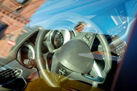 car dashboard and steering wheel through the window on a sunny day, vehicle interior