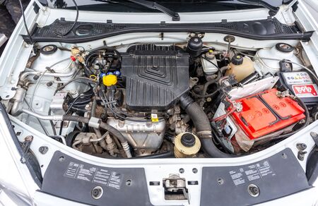 Samara, Russia - February 23, 2020: Car engine of vehicle Renault Sandero, under the hood of a vehicle