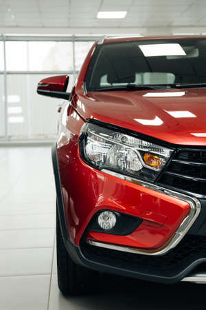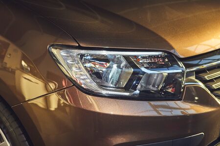 Vinnitsa, Ukraine - April 02, 2019. Renault Duster - new model car presentation in showroom - headlight
