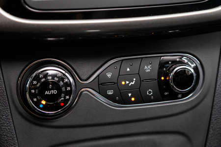 Bucharest, Romania - April 11, 2021: Shallow depth of field (selective focus) image with the Dacia logo on a Duster steering wheel.