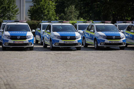 Bucharest, Romania - July 29, 2020: Romanian Police new Dacia cars on display during an event of the Police Force.