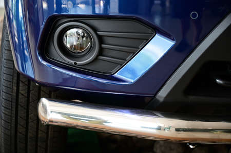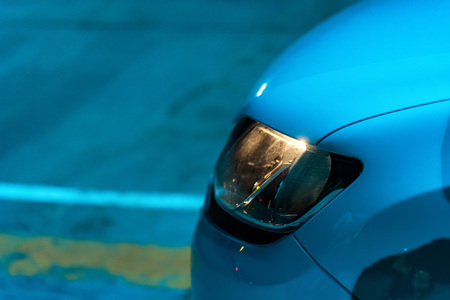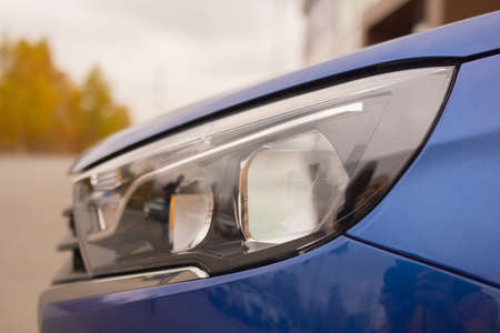 Close up of modern sedan headlamp. Front view shot from side of vehicle. Car headlight background.