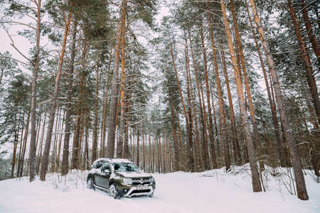 Renault Duster Suv Parked In Snowy Forest. Duster Produced Jointly By French Manufacturer Renault And Its Romanian Subsidiary Dacia Since 2010