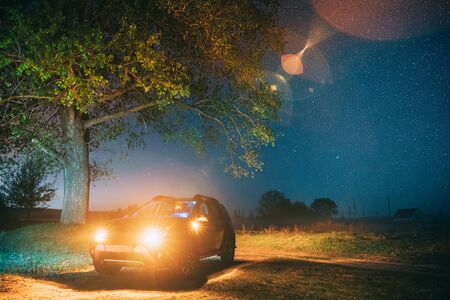 Night Starry Sky Above Car SUV Parked Near Lonely Tree in Night Forest. Sunset Lights.