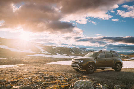 Aurlandsfjellet, Norway - June 13, 2019: Car Renault Duster SUV Parked Near Aurlandsfjellet Scenic Route Road In Summer Norwegian Landscape. Popular Destination In Sunset Lights.