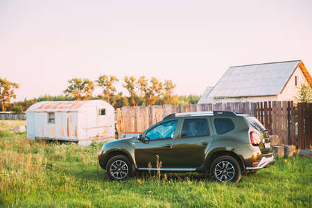 Gomel, Belarus - August 23, 2019: Green Car Renault Duster SUV Parked In Village.