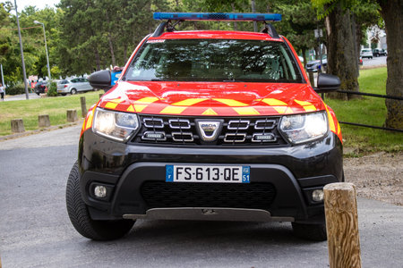 Hardelot, France - Aug 21, 2023: Close-up of a Dacia Gendarmerie vehicle in France, featuring distinctive red and yellow reflective safety markings on the hood