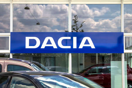 Krakow, Poland, July 12, 2019: Dacia logo on the car dealership banner. Dacia is a Romanian car and automotive manufacturer, part of Renault group