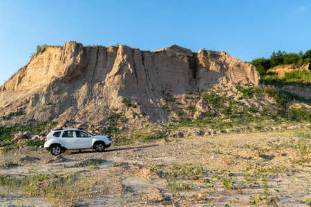 Vitebsk, Belarus - July 2021: White Renault Duster against the background of a high cliff of an old quarry, 4x4, off-road. Horizontal photo.