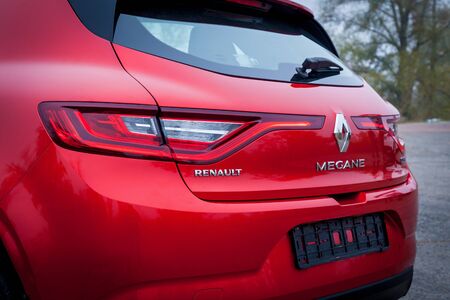 Ukraine Kiev September 24, 2019: A new car Renault Megane Sedan red color is parked in the autumn park with many fallen leaves.