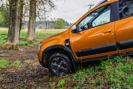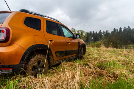 MOSCOW, RUSSIA - MAY 08, 2021 Renault Duster second generation. Compact SUV car also called Dacia Duster. Close up side view on nature off-road obstacle. Orange 4x4 car.