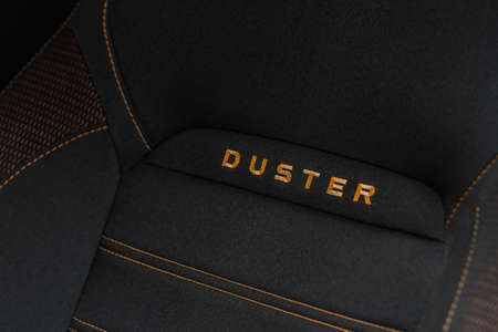MOSCOW, RUSSIA - MAY 08, 2021 Renault Duster second generation details view. Interior close up view of the model badge on the car seats of the quality fabric.