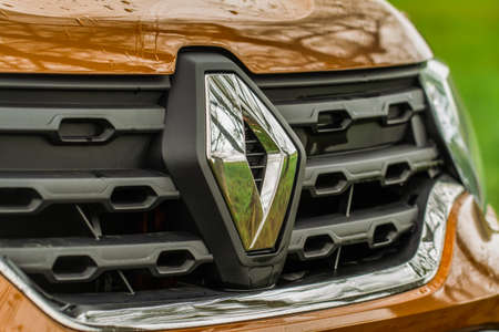 MOSCOW, RUSSIA - MAY 08, 2021 Renault company logo close-up view on the car bonnet. Logo of the French manufacturer Renault with raindrops.