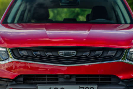 MOSCOW, RUSSIA - JUNE 14, 2021 Geely Tugella also called Geely Xingyue, compact crossover SUV model year 2021 on city background. Exterior front side details close up view.