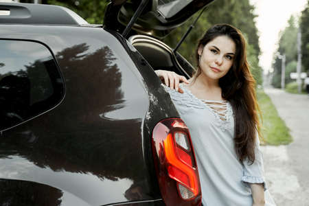MOSCOW, RUSSIA - MARCH 12, 2021: new blue Renault captur suv crossover with open trunk stand on offroad path