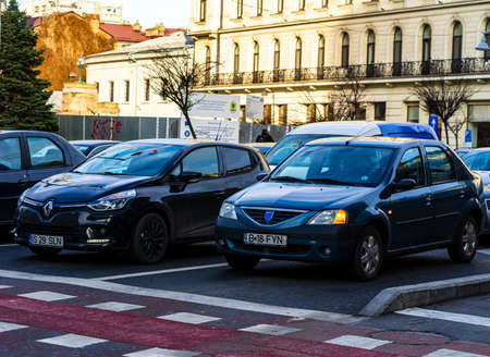 Car traffic at rush hour in downtown area of the city. Car pollution, traffic jam in the morning and evening in the capital city of Bucharest, Romania, 2021
