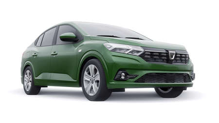 Paris. France. March 22, 2022. Dacia Logan 2021 is a cheap family European car also known under the Renault brand. A green car model on a white background. 3d illustration.