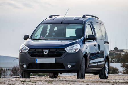 ALICANTE, SPAIN - May 01, 2019: Alicante, Valencia, Spain. May 1, 2019. Front shot of a Dacia Dokker hybrid van, dark blue with transverse roof bars and ECO label.