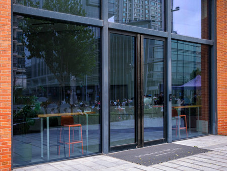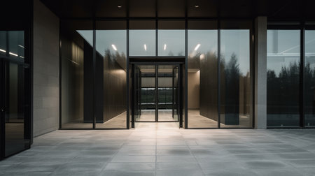 This image showcases modern glass doors that open into a spacious contemporary lobby filled with indoor plants, creating an inviting and tranquil atmosphere.