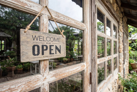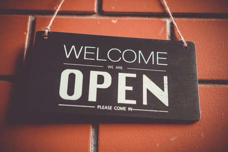 Welcome we're open vintage black and white retro sign on a coffee glass door cafe after virus lockdown quarantine. Owner small business, food and drink, business reopen again concept.