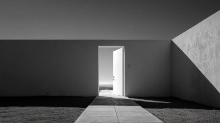 A single door stands open in a stark setting while several doors remain closed, creating strong contrasts and clear lines.