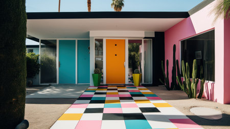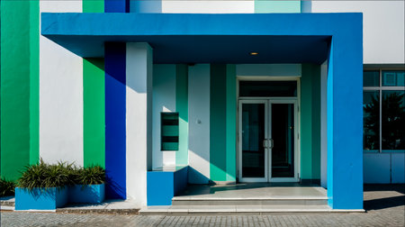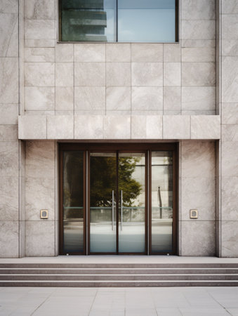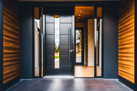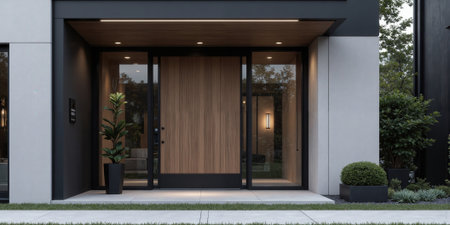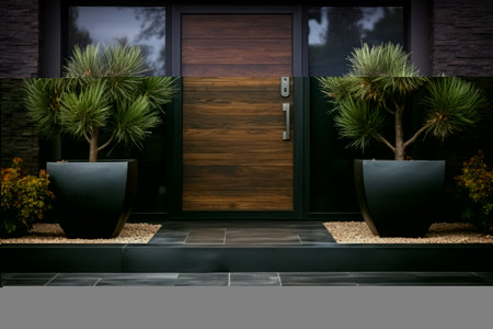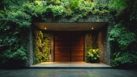 This captivating entrance features a blend of modern architecture and lush greenery, creating a tranquil atmosphere. The elegant wooden doors invite exploration.
