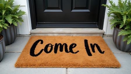 Stylish Come In doormat at contemporary front door adorned with potted plants