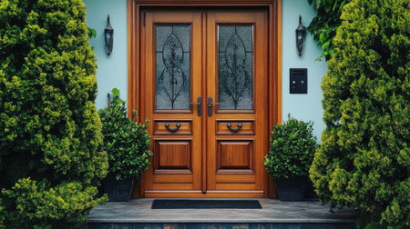 This image features elegant wooden double doors framed by lush greenery, creating a welcoming and serene entrance to a residential home, highlighting beauty in design.