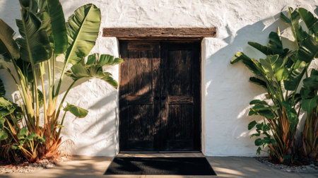 Tropical minimalist doorway, dark wood double doors within white stucco wall, banana plants flanking both sides, black doormat perfectly centered, warm natural light, symmetrical photo