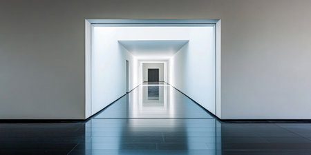 A spacious and minimalist hallway showcases multiple doorways with sleek lines and reflective flooring, creating a bright and airy atmosphere in a contemporary setting.