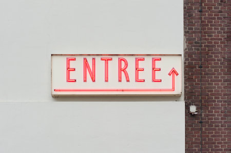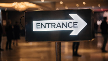 Focused medium shot capturing an illuminated digital arrow sign directing attendees surrounded by outoffocus venue ambiance to highlight navigation clarity.
