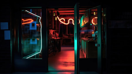 A striking door with vibrant neon lighting outlines is positioned on a dark, empty street. The atmosphere evokes intrigue, suggesting secrets behind the entrance.