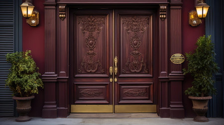 A beautiful entrance showcasing a wooden door framed by classic columns, illuminated by soft sunlight. Ideal for design and architecture themes.