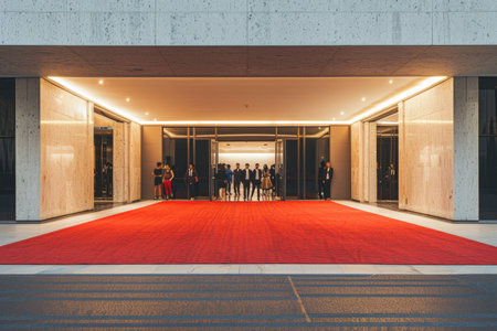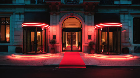 A stunning hotel entrance featuring striking red neon lights and a luxurious red carpet, creating an inviting ambiance in an upscale urban environment at dusk.