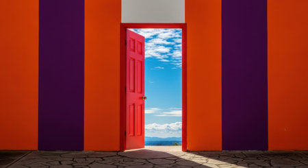An inviting red door stands ajar, revealing a breathtaking view of a sunny tropical landscape, promising escape and adventure.