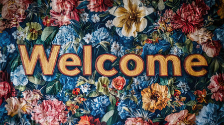 Welcome word in floral style on blue background. Greeting text for events, weddings, promotion and hospitality industry.