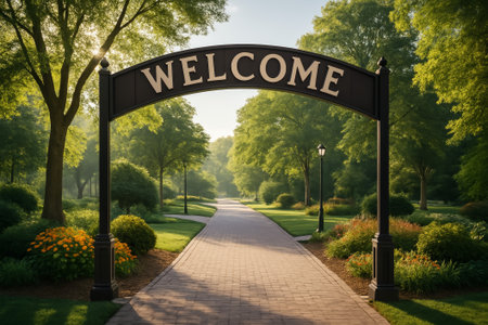 A welcoming sign above a serene pathway surrounded by lush greenery and colorful flowers