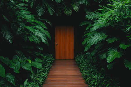Lush green entrance door surrounded by tropical foliage, creating a serene and inviting atmosphere Perfect for nature themed and wellness concepts