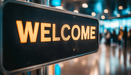 Bright Yellow Glowing Welcome Sign in a Busy Modern Building with Blurred People in Background.