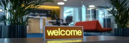 Welcome Sign In Office Reception Area Bright, Modern Decor And Blurred Background With Pot Plants