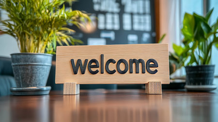 Welcome Sign on Table with Plants, Symbolizing a Warm Onboarding Process in the Workplace