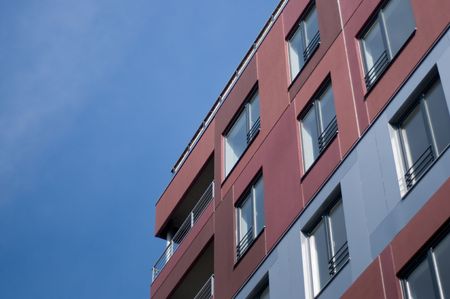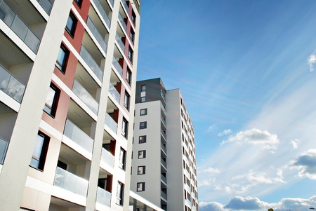 Modern new building with a lot of flats. There are windows and balconies. Light blue sky above