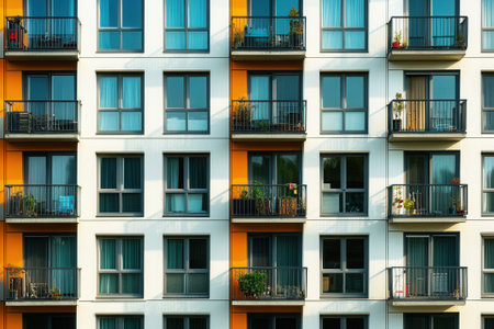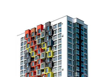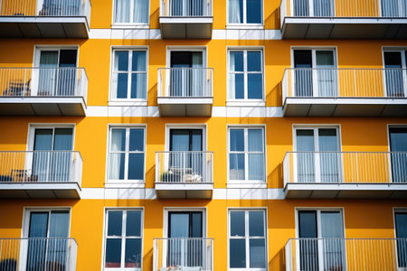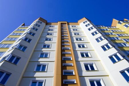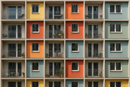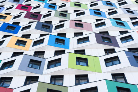 colorful facade of modern apartment building, symbol of housing, rental, anonymity, big city